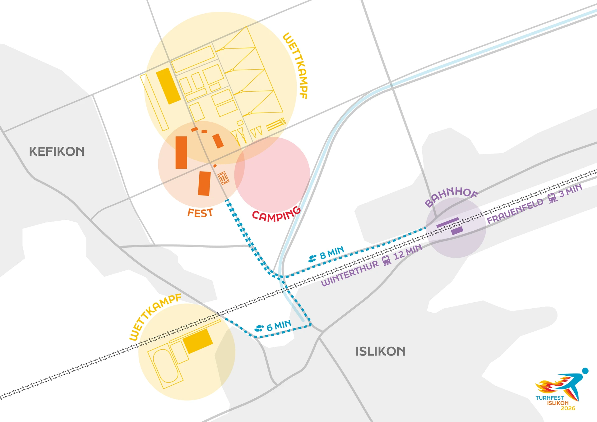 Unser Turnfest überzeugt mit kurzen Distanzen und einem kompakten Gelände. In nur 12 Minuten reist du mit dem Zug von Winterthur an – oder sogar in nur 3 Minuten von Frauenfeld. Dein Ziel: der Bahnhof Islikon. Direkt daneben liegt das Festgelände mit allem, was dazugehört.